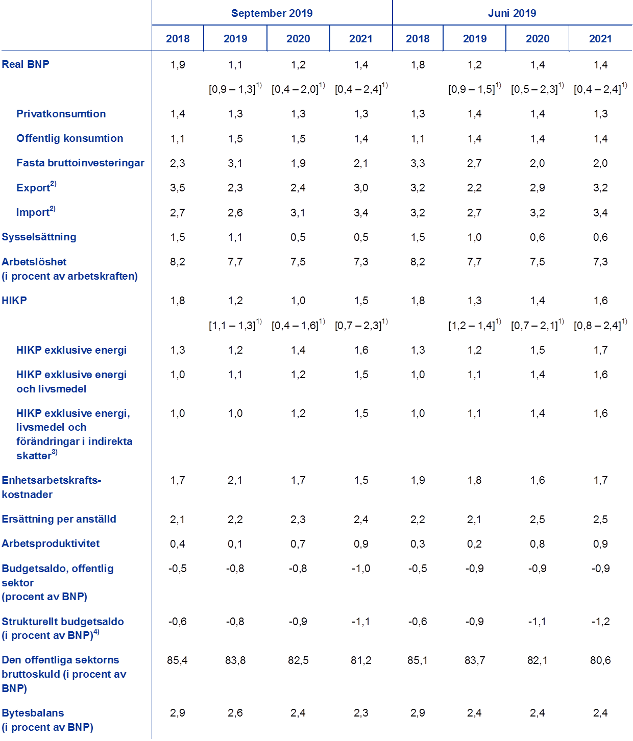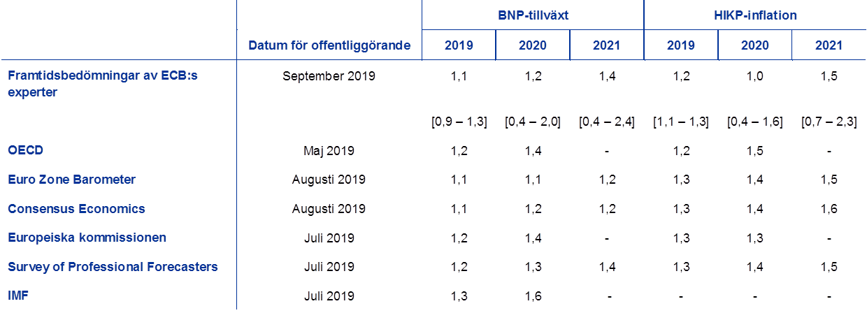 Såsom anges i tabellen ligger aktuella prognoser för den reala BNP-tillväxten och HIKP-inflationen från de flesta andra institut inom intervallen kring framtidsbedömningarna (anges inom hakparenteser i tabellen). Värdet för HIKP-inflationen 2020 är märkbart lägre än alla andra prognoser. Detta kan eventuellt bero på mer aktuella oljeprisantaganden i framtidsbedömningarna från september 2019.