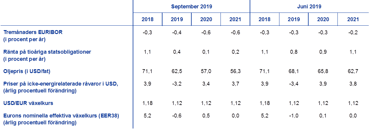 Jämfört med framtidsbedömningarna från juni 2019 omfattar de tekniska antagandena lägre oljepriser och väsentligt lägre räntor. De tekniska antagandena om räntor och råvarupriser baseras på marknadsförväntningar med stoppdatum den 19 augusti 2019. De korta räntorna avser tremånaders EURIBOR, med marknadsförväntningar härledda från terminsräntor. Beräkningsmetoden innebär en genomsnittsnivå på de korta räntorna på -0,4 procent för 2019 och -0,6 procent 2020 och 2021. Marknadens förväntningar för de nominella tioåriga statsobligationsräntorna i euroområdet innebär en genomsnittlig nivå på 0,4 procent 2019, 0,1 procent 2020 och 0,2 procent 2021.[2] Jämfört med framtidsbedömningarna från juni 2019 har marknadens förväntningar för de korta räntorna reviderats ned med 10 baspunkter för 2019, 30 baspunkter för 2020 och runt 40 baspunkter för 2021, medan de nominella tioåriga statsobligationsräntorna i euroområdet har reviderats ned med cirka 40 baspunkter för 2019, 80 baspunkter för 2020 och cirka 90 baspunkter för 2021.