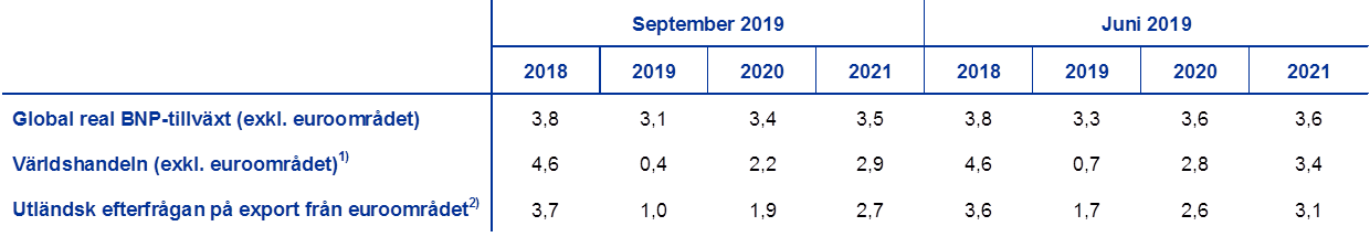 På medellång sikt förväntas den globala tillväxten ta fart och stabilisera sig på en nivå som ligger under det långsiktiga genomsnittet på 3,8 procent. Efter att ha sjunkit till 3,1 procent 2019 från 3,8 procent 2018, beräknas den globala tillväxten (exklusive euroområdet) ta fart och stabiliseras på 3,5 procent 2021. Utvecklingen i global tillväxt drivs av tre huvudsakliga faktorer. För det första väntas konjunkturutvecklingen i utvecklade ekonomier att fortskrida i en långsammare takt eftersom kapacitetsbegränsningarna blir alltmer bindande p.g.a. positiva produktionsgap och låg arbetslöshet i de viktigaste ekonomierna. Mot slutet av bedömningsperioden kommer stödet från policyåtgärder dock gradvis att avta. För det andra väntas den gradvisa inbromsningen i kinesisk ekonomi och dess ombalansering från investeringar till konsumtion negativt påverka den globala tillväxten, framför allt handeln. För det tredje väntas däremot framväxande ekonomier (med undantag för Kina) stödja den globala tillväxten i takt med att de återhämtar sig från tidigare recessioner och för att negativa produktionsgap blir allt mindre. Jämfört med framtidsbedömningarna från juni 2019 revideras de globala tillväxtutsikterna ned under bedömningsperioden, vilket återspeglar en mindre dynamisk återhämtning i vissa tillväxtekonomier än vad som tidigare förväntats och, i mindre utsträckning, effekterna av pågående handelsspänningar.