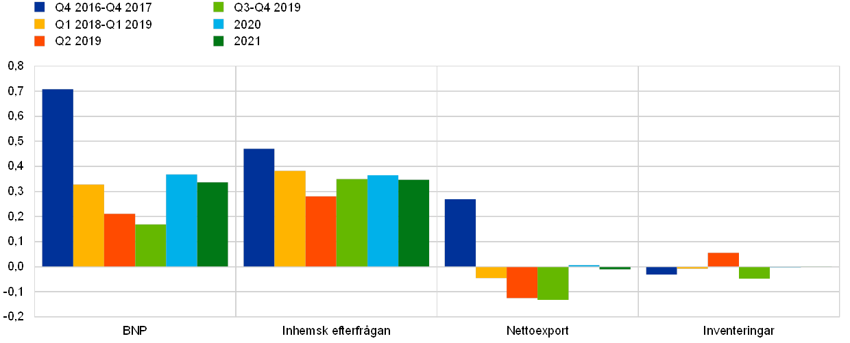 Anm. En uppdelning av BNP per komponent för andra kvartalet 2019 var inte tillgänglig vid stoppdatumet för framtidsbedömningarna och beräknades således av ECB:s experter.