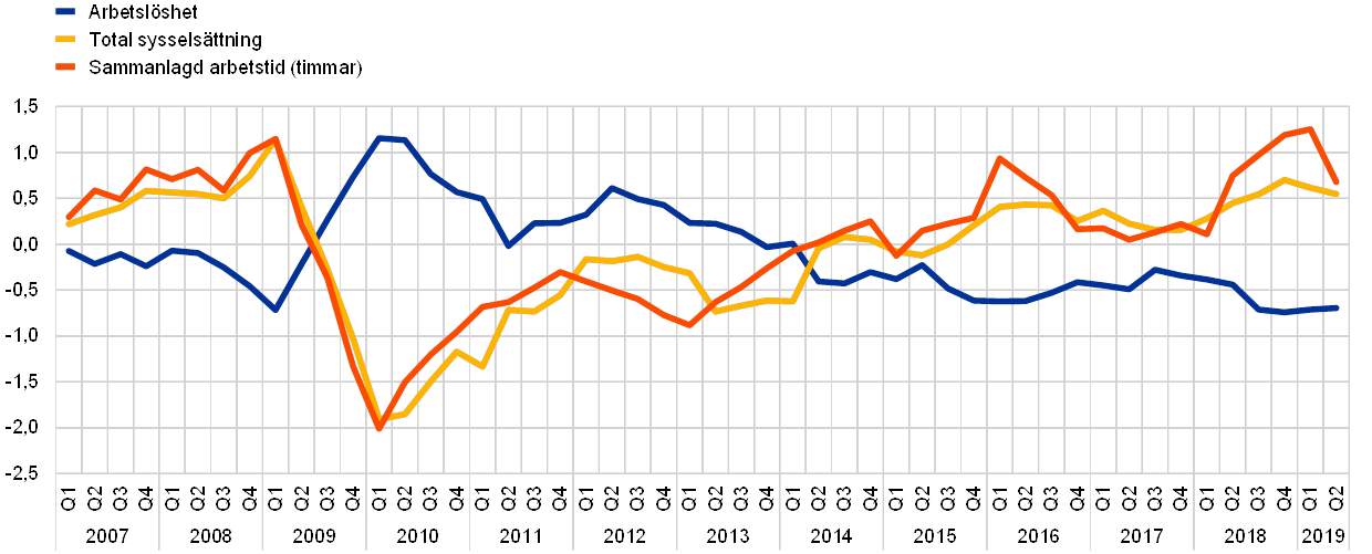 Anm.: Ett positivt restvärde tyder på att variabeln i fråga nådde en högre nivå än vad som förutsågs i Okun-förhållandet. Diagrammet visar de residualer – dvs. oförklarad del av skattningarna – som hänför sig till arbetslöshet och tillväxt på årsbasis av total sysselsättning och sammanlagd arbetstid. Uppskattningarna baseras på uppgifter för perioden mellan första kvartalet 1998 och andra kvartalet 2019. Residualer är från ett statiskt Okun-förhållande som kopplar samman årliga förändringar i arbetslöshetsgrad, årlig tillväxttakt för total sysselsättning och årlig tillväxttakt för totalt antal timmar med samtidig årlig tillväxt av real BNP.