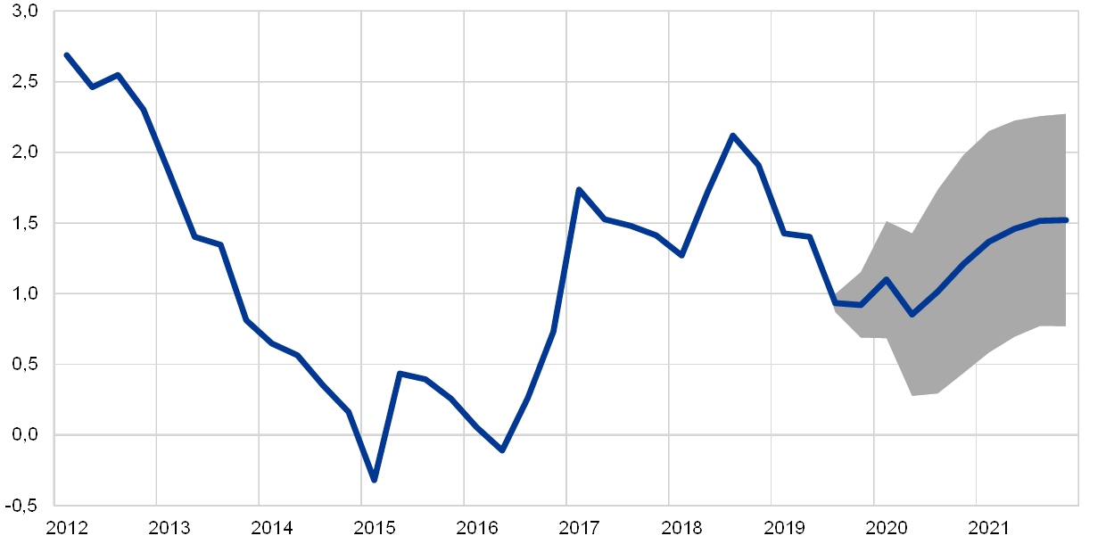 HIKP-inflationen förväntas avta i år och förbli dämpad nästa år, för att sedan åter stiga till 1,5 procent 2021. HIKP-inflationen, exklusive energi och livsmedel, kommer att öka något i slutet av 2019 och röra sig sidledes under 2020, innan den tilltar under 2021, med stöd av det förväntade uppsvinget i aktiviteten och den därmed förknippade återhämtningen i vinstmarginalerna som väntas följa när tidigare ökningar i arbetskraftskostnaderna påverkar priserna. Jämfört med framtidsbedömningarna från juni 2019 har HIKP-inflationen reviderats ned, till stor del beroende på energikomponenten som revideras betydligt nedåt för både 2019 och 2020 p.g.a. lägre oljepriser. Dessutom har HIKP-inflationen, exklusive energi och livsmedel, också reviderats nedåt, vilket återspeglar svagare data, svagare aktivitet, indirekta effekter av lägre energipriser samt bestående tidigare prognosöverskattningar.[1]