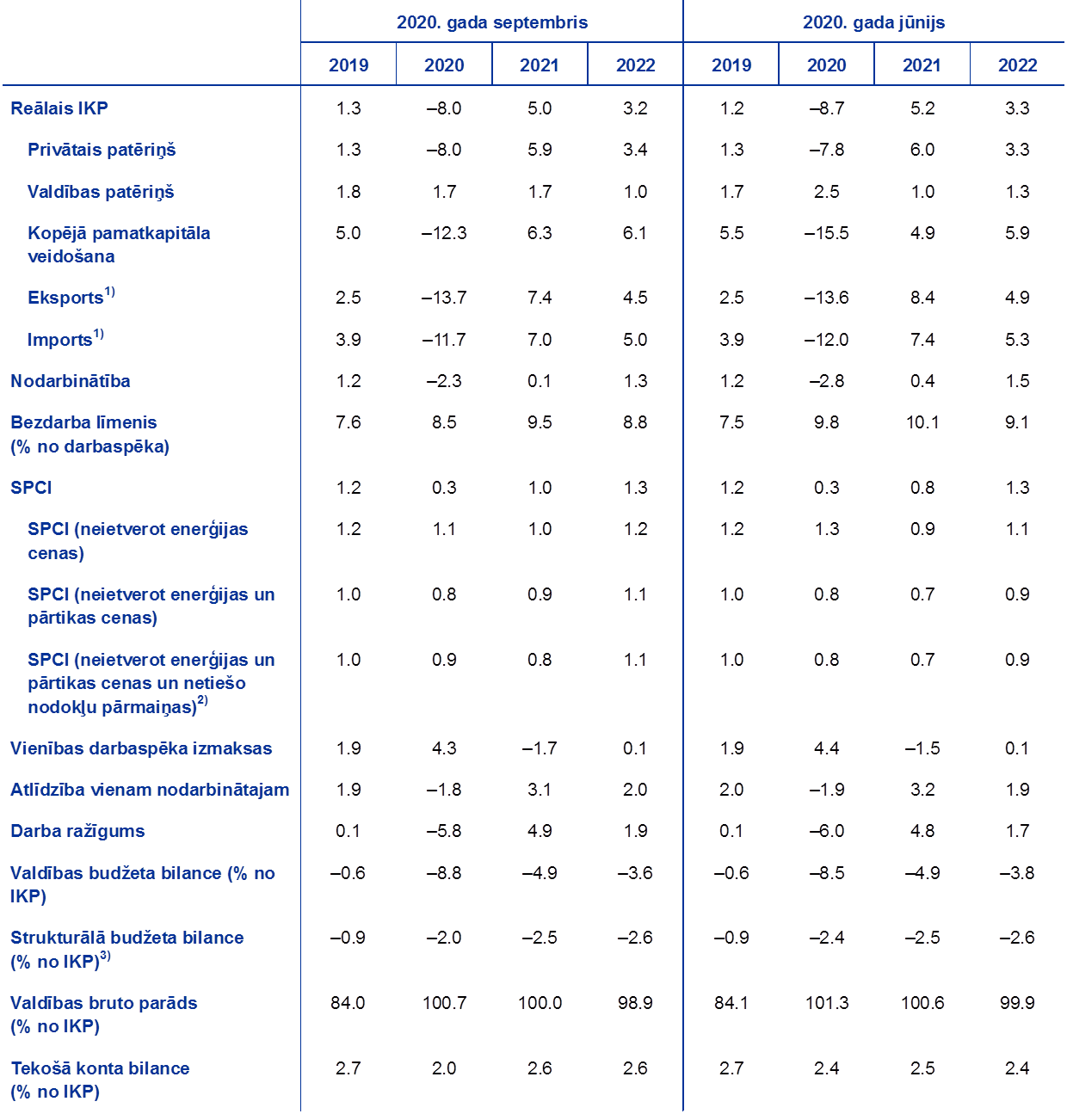 Piezīmes. Reālais IKP un tā komponenti, vienības darbaspēka izmaksas, atlīdzība vienam nodarbinātajam un darba ražīgums noteikti, izmantojot atbilstoši darbadienu skaitam koriģētus datus. Šajā tabulā nav atainoti iespēju aplēšu diapazoni. Tas atspoguļo faktu, ka standarta diapazonu aprēķini (kas balstās uz vēsturiskajām aplēšu kļūdām) pašreizējos apstākļos nesniegtu ticamas norādes attiecībā uz nepieredzēto nenoteiktību, kas pašlaik saistīta ar iespēju aplēsēm. Tāpēc, lai labāk ilustrētu pašreizējo nenoteiktību, 3. ielikumā sniegti alternatīvi scenāriji, kas balstīti uz atšķirīgiem pieņēmumiem par Covid-19 pandēmijas attīstību nākotnē un ar to saistītajiem ierobežojošajiem pasākumiem.
