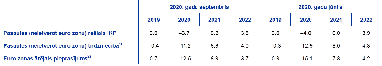 Paredzams, ka pasaules reālais IKP (neietverot euro zonu) pēc 2020. gadā vērojamā sarukuma par 3.7% atsāks pieaugt un palielināsies par 6.2% 2021. gadā un 3.8% 2022. gadā. Taču šī aktivitātes līmeņa atjaunošanās nav pilnīga. Tiek pieņemts, ka dažas sociālās distancēšanās formas saglabāsies, un medicīnisks risinājums gaidāms tikai aptuveni 2021. gada vidū. Pasaules bāzes scenārijā pieņemts, ka inficēšanās gadījumu skaits nedaudz pieaugs, taču tie būs vairāk lokalizēti nekā pirmā viļņa laikā un tiks risināti, izmantojot mērķtiecīgākus ierobežojošos pasākumus. Mācoties no iepriekšējās pieredzes, šādiem pasākumiem būs mazāk graujoša ietekme uz ekonomisko aktivitāti. Ar pandēmijas attīstību un tās ekonomiskajām sekām saistītā nenoteiktība nelabvēlīgi ietekmēs patērētāju noskaņojumu. Salīdzinājumā ar Eurosistēmas speciālistu 2020. gada jūnija iespēju aplēsēm pasaules (neietverot euro zonu) reālā IKP izaugsme 2020. un 2021. gadam koriģēta un nedaudz paaugstināta un 2022. gadam pamatā nav koriģēta.
