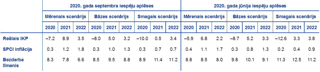 Kopumā prognozēts, ka 2021. un 2022. gadā reālā IKP atveseļošanās saskaņā ar mēreno scenāriju būs spēcīgāka nekā saskaņā ar smago scenāriju (sk. A tabulu). Saskaņā ar mēreno scenāriju, kurā ierobežojošie pasākumi ļauj ekonomiskajai aktivitātei pakāpeniski normalizēties, tiek prognozēta spēcīga reālā IKP kāpuma atjaunošanās 2021. gadā. To stimulē pieņēmums, ka līdz 2021. gada vidum tiks rasts efektīvs medicīnisks risinājums, nodrošinot relatīvi strauju atveseļošanos arī 2022. gadā. Reālā IKP kāpuma temps 2021. gadā ievērojami pārsniegtu pamataplēses līmeni un 2022. gada beigās būtu aptuveni par 4.5% augstāks nekā pamataplēsē. Turpretī smagajā scenārijā vīrusa atkārtots uzliesmojums, ierobežojošo pasākumu nepietiekamā efektivitāte un pieņēmums par ilgstošiem ekonomiskiem postījumiem turpinātu kavēt ekonomiskās aktivitātes atjaunošanos visā iespēju aplēšu periodā. Gaidāms, ka ekonomiskās aktivitātes dinamika 2021. gadā faktiski nemainīsies, bet reālais IKP līdz 2022. gada beigām salīdzinājumā ar pamataplēsi saruks par 5.8%.