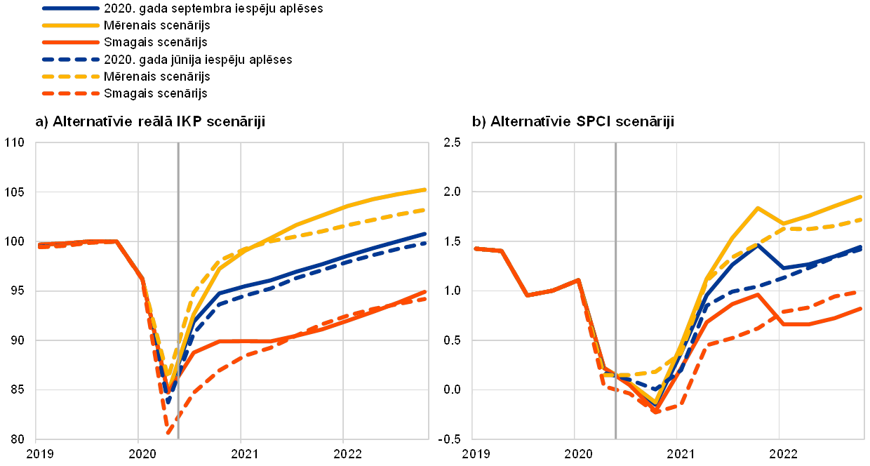Mērenajā scenārijā pieņemts, ka pēc nesenā inficēšanās skaita pieauguma vīrusa izplatība tiek veiksmīgi ierobežota, bet smagais scenārijs paredz, ka notiek atkārtots spēcīgs pandēmijas uzliesmojums. Abu scenāriju raksturojums pamatā ir līdzīgs Eurosistēmas speciālistu 2020. gada jūnija makroekonomisko iespēju aplēšu raksturojumiem. Mērenajā scenārijā pieņemts, ka infekcijas izplatība pēc nesenā kāpuma stabilizējas un valsts iestāžu un tautsaimniecības dalībnieku veiktie ekonomiskie atbildes pasākumi ir ļoti veiksmīgi. Smagajā scenārijā tiek paredzēts spēcīgs atkārtots pandēmijas uzliesmojums, liekot valdībām atgriezties pie stingriem ierobežojošiem pasākumiem. Ilgstošie centieni ierobežot vīrusa izplatību visās tautsaimniecības nozarēs turpinātu ierobežot ekonomisko aktivitāti spēcīgāk, nekā paredzēts bāzes scenārijā, līdz tiktu rasts medicīnisks risinājums. Tiek pieņemts, ka tas notiks līdz 2021. gada vidum, taču tā piemērošana nespēs efektīvi ierobežot vīrusu smagajā scenārijā. Salīdzinājumā ar pamataplēsē izmantoto raksturojumu smagajā scenārijā aktivitātes kritums visās tautsaimniecības nozarēs ir spēcīgāks un ilgāks. To zināmā mērā vēl vairāk pavājina augošas maksātnespējas gadījumu skaits, veidojot kreditēšanas frikcijas, kas nelabvēlīgi ietekmē mājsaimniecību un uzņēmumu aizņemšanās izmaksas un finansējuma pieejamību.