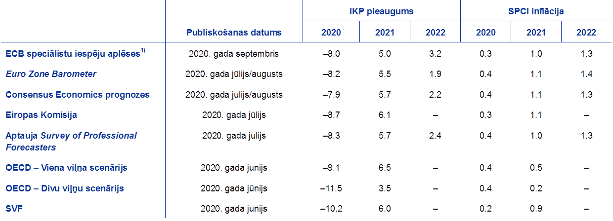 Avoti: MJEconomics for the Euro Zone Barometer, 2020. gada 17. augusts, 2022. gada dati ņemti no 2020. gada jūlija apsekojuma; Consensus Economics prognozes, 2020. gada 14. augusts, 2022. gada dati ņemti no 2020. gada jūlija apsekojuma; Eiropas Komisijas pagaidu prognozes, 2020. gada vasara; ECB aptauja Survey of Professional Forecasters, 2020. gada 3. ceturksnis, aptauja veikta laikā no 2020. gada 30. jūnija līdz 6. jūlijam; OECD Tautsaimniecības perspektīvas Nr. 107, 2020. gada jūnijs. Divu viļņu scenārijs apzīmē scenāriju, kurā 2020. gada 4. ceturksnī notiek otrs, mazāk intensīvs vīrusa uzliesmojums, bet viena viļņa scenārijā ierobežojošie pasākumi veiksmīgi apslāpē pašreizējo uzliesmojumu. Tabula ietver abus scenārijus, jo OECD abiem piemēro vienādu svērumu, nodefinējot vienu bāzes scenāriju; SVF Pasaules tautsaimniecības perspektīva, 2020. gada 24. jūnijs.