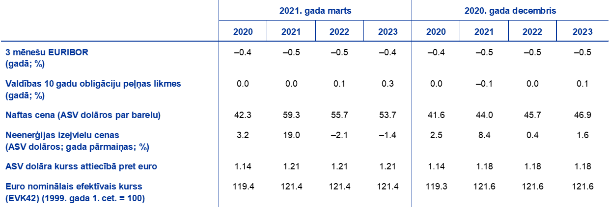 Salīdzinājumā ar 2020. gada decembra iespēju aplēsēm pašreizējie tehniskie pieņēmumi ietver augstākas ilgtermiņa procentu likmes, būtiski augstākas naftas cenas un nedaudz vājāku euro efektīvo kursu. Tehniskie pieņēmumi par procentu likmēm un izejvielu cenām balstīti uz tirgus gaidām atbilstoši stāvoklim 2021. gada 16. februārī. Īstermiņa procentu likmes attiecas uz 3 mēnešu EURIBOR, tirgus gaidas iegūstot, pamatojoties uz biržā tirgoto nākotnes līgumu procentu likmēm. Saskaņā ar attiecīgo metodiku šo īstermiņa procentu likmju vidējais rādītājs 2021. un 2022. gadā būs –0.5% un 2023. gadā – –0.4%. Tirgus gaidas attiecībā uz euro zonas valstu valdības 10 gadu obligāciju nominālajām peļņas likmēm liecina, ka 2021. gadā vidējais līmenis būs 0.0%, 2022. gadā – 0.1%, 2023. gadā – 0.3%.[2] Salīdzinājumā ar 2020. gada decembra iespēju aplēsēm tirgus gaidas attiecībā uz īstermiņa procentu likmēm 2023. gadā nedaudz palielinājušās, savukārt tirgus gaidas attiecībā uz euro zonas valstu valdības 10 gadu obligāciju nominālajām peļņas likmēm 2021.–2023. gadā pieaugušas par 10–20 bāzes punktiem.