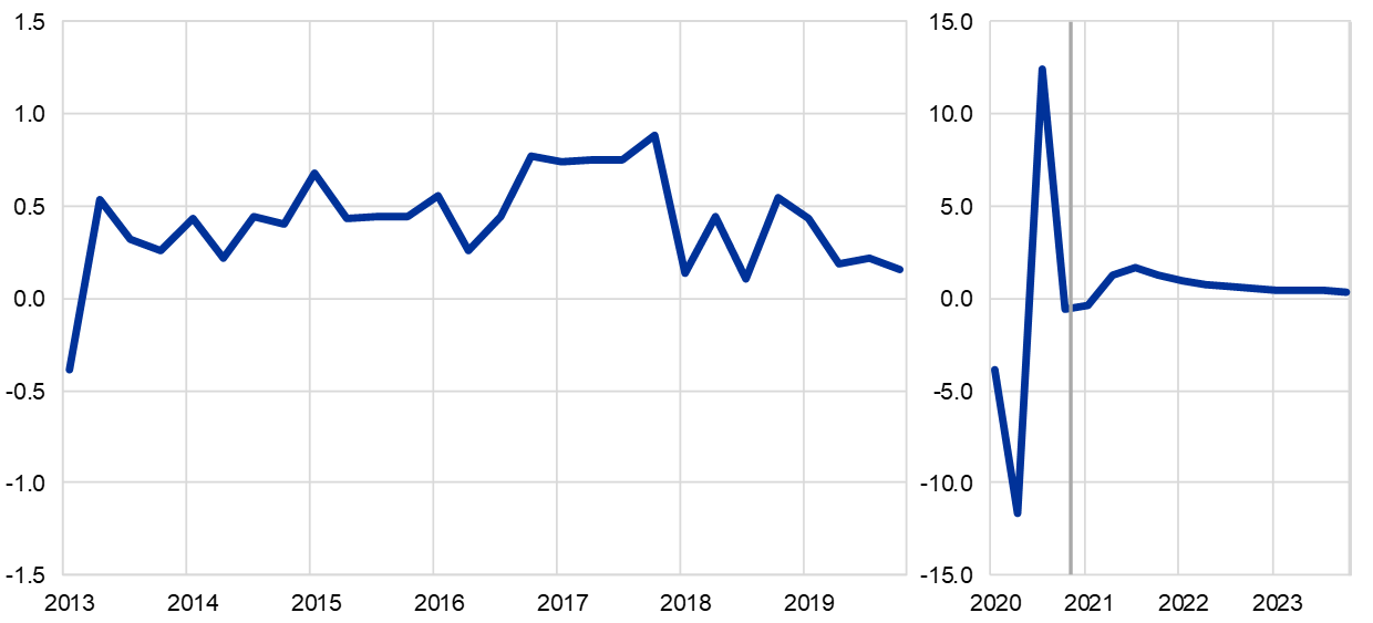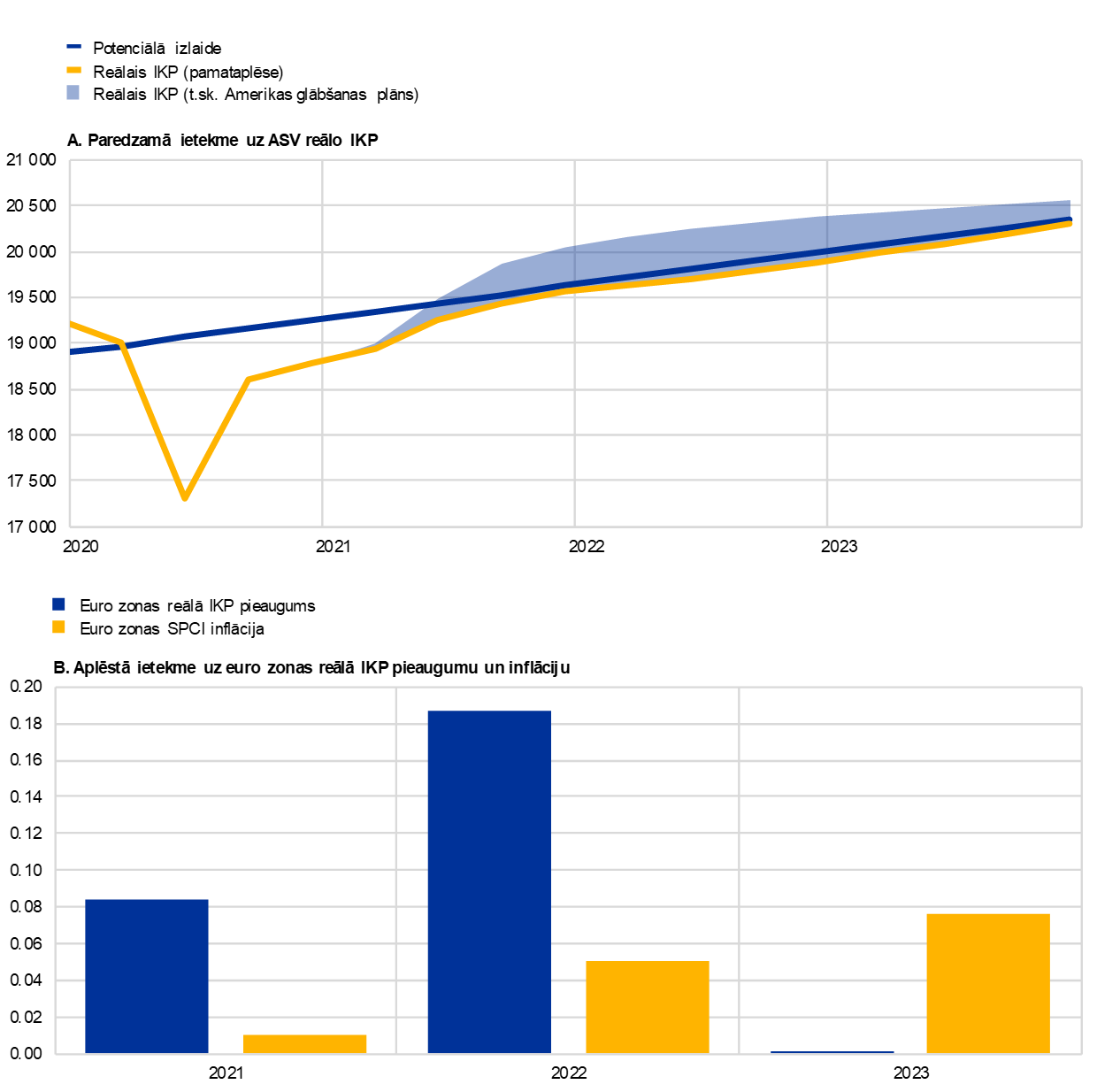 Piezīmes. ASV rezultātiem izmantots globālais integrētais monetārais un fiskālais modelis (GIMF), neparedzot monetārās politikas reakciju 2021. un 2022. gadā, pieņemot, ka kopējais paketes apjoms ir 1.9 trlj. ASV dolāru; veikts arī novērtējums. Veicot modelēšanu euro zonai, kur ietverta euro zonas iekšējās tirdzniecības netiešā ietekme, vērtē pārmaiņu ietekmi uz euro zonas ārējo pieprasījumu, konkurentu cenām nacionālajās valūtās, akciju kursiem un kredītu procentu likmju starpībās ietvertajām riska prēmijām. Euro zonas fiskālā un monetārā politika tiek saglabāta eksogēna. Tiek pieņemts, ka nominālās īstermiņa un ilgtermiņa procentu likmes, nominālais valūtas kurss un naftas cenas nemainās. Ietekme uz euro zonu tiek aprēķināta, izmantojot ECB jauno vairāku valstu modeli, kurā izmantots retrospektīvs gaidu veidošanas modelis, ietverot apguvi.[10]