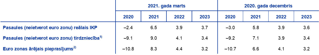 Pasaules (neietverot euro zonu) importa izaugsme 2021. gadam koriģēta un būtiski paaugstināta. Gaidāms, ka imports 2021. gadā pieaugs par 9.0% un pēc tam 2022. un 2023. gadā attiecīgi samazināsies par 4.1% un 3.4%. Salīdzinājumā ar 2020. gada decembra iespēju aplēsēm pasaules imports un īpaši euro zonas ārējais pieprasījums koriģēts un būtiski palielināts sakarā ar ES un Apvienotās Karalistes tirdzniecības vienošanos un – mazākā mērā – spēcīgākas attīstīto valstu atveseļošanās prognozēm. Tādējādi paredzams, ka euro zonas ārējais pieprasījums šogad pieaugs par 8.3% un pēc tam 2022. un 2023. gadā palielināsies attiecīgi līdz 4.4% un 3.2%, kā rezultātā 2021. gadā tiks veikta būtiska augšupvērsta korekcija un 2022. gadā – mazāka korekcija.