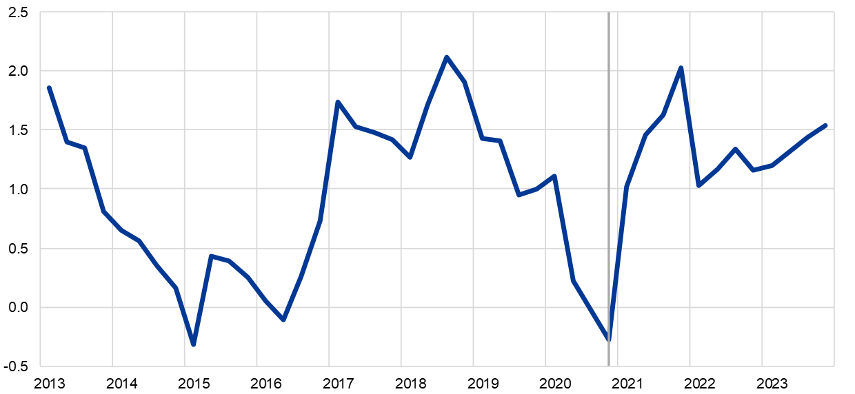 Neraugoties uz spēcīgajām svārstībām 2021. gadā, gaidāms, ka vienības darbaspēka izmaksas kopumā radīs tikai nelielu inflācijas spiedienu. Spēcīgās svārstības lielā mērā atspoguļo gaidāmās darba ražīguma, nevis darba samaksas norises. Gaidāms, ka sakarā ar spēcīgo darba ražīguma pieaugumu 2021. gadā, kad ražošana atveseļosies, bet darba tirgi joprojām būs mazaktīvi, un – mazāk – 2022. gadā, vienības darbaspēka izmaksu kāpums šajos divos gados būs negatīvs, pirms atkal kļūs mazliet pozitīvs 2023. gadā.