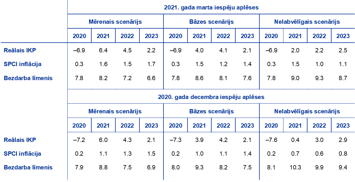Piezīmes. Reālais IKP un tā komponenti, vienības darbaspēka izmaksas, atlīdzība vienam nodarbinātajam un darba ražīgums noteikti, izmantojot atbilstoši darbadienu skaitam koriģētus datus. Skaitļi var atšķirties no jaunākajām Eurostat publikācijām sakarā ar datu publiskojumiem pēc iespēju aplēšu pēdējā datu aktualizēšanas datuma. Šajā tabulā nav atainoti iespēju aplēšu diapazoni. Tas atspoguļo faktu, ka standarta diapazonu aprēķini (kas balstās uz vēsturiskajām aplēšu kļūdām) pašreizējos apstākļos nesniegtu ticamas norādes uz nepieredzēto nenoteiktību, kas pašlaik saistīta ar iespēju aplēsēm. Tāpēc, lai labāk ilustrētu pašreizējo nenoteiktību, 5. sadaļā sniegti alternatīvi scenāriji, kas balstīti uz atšķirīgiem pieņēmumiem par Covid-19 pandēmijas attīstību nākotnē un ar to saistītajiem ierobežojošajiem pasākumiem.