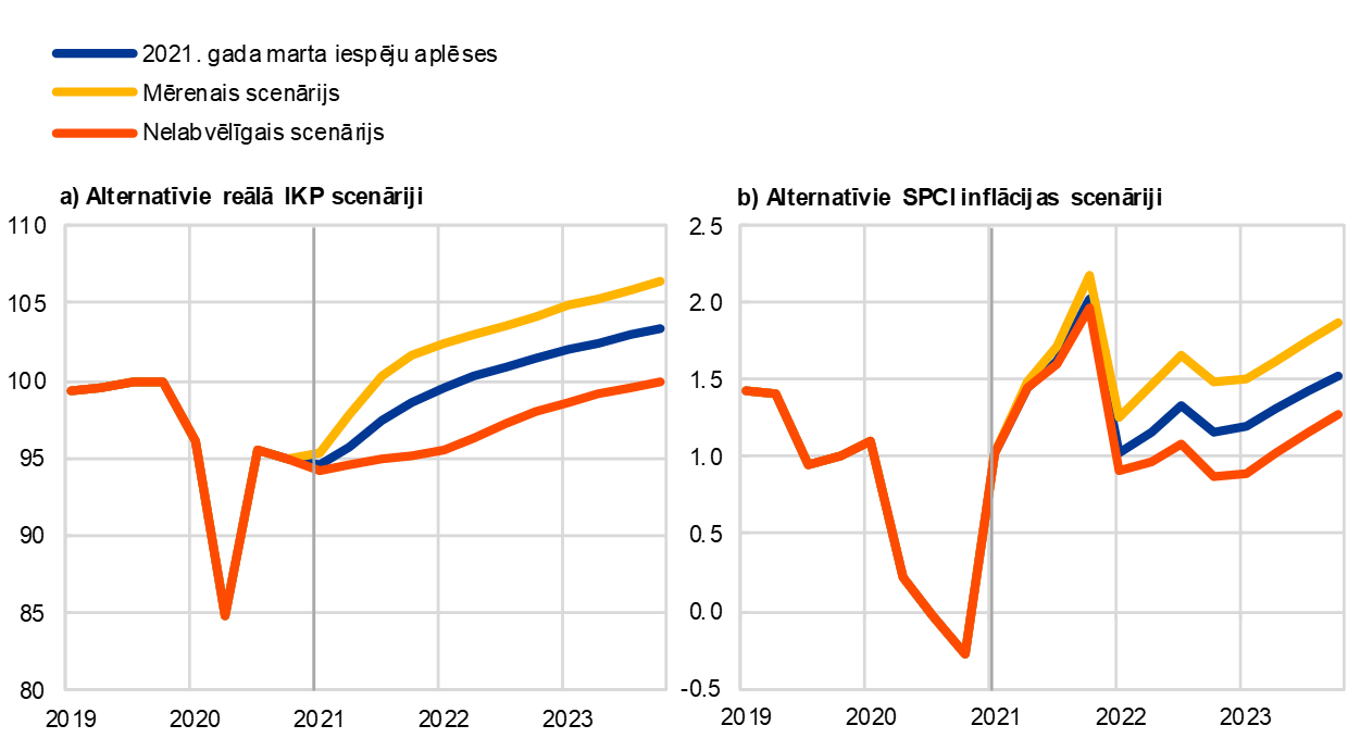 Tā kā joprojām valda būtiska nenoteiktība par Covid-19 pandēmijas turpmāko attīstību un tautsaimniecībai nodarīto kaitējumu, divi scenāriji, kas ietver ECB speciālistu 2021. gada marta iespēju aplēšu bāzes scenārija alternatīvas, ilustrē iespējamās Covid-19 pandēmijas ietekmes uz euro zonas tautsaimniecību diapazonu.