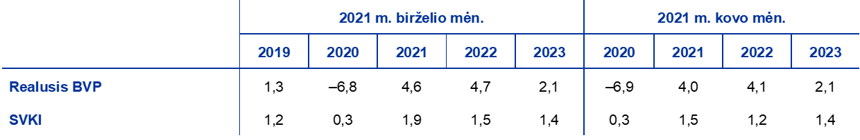Palyginti su 2021 m. kovo mėn. prognozėmis, 2021 ir 2022 m. augimo perspektyvos yra geresnės. Daroma prielaida, kad dėl pažangos, padarytos vykdant vakcinacijos kampaniją, didelės papildomos fiskalinės politikos priemonių paramos (iš dalies finansuojamos programos „Next Generation EU“ lėšomis) ir geresnių užsienio paklausos perspektyvų, kurias patvirtina neseniai JAV pradėtas vykdyti fiskalinės politikos priemonių paketas, pandemijos ekonominis poveikis bus mažesnis. Dėl taikomų pinigų, fiskalinės ir makroprudencinės politikos priemonių turėtų pavykti išvengti didelių finansinių pasekmių ir sušvelninti dėl krizės patiriamus ekonominius nuostolius. Todėl tikimasi, kad iki 2022 m. pabaigos realusis BVP bus tik 1,3 % mažesnis, negu buvo numatyta prieš prasidedant pandemijai skelbtose prognozėse[2].