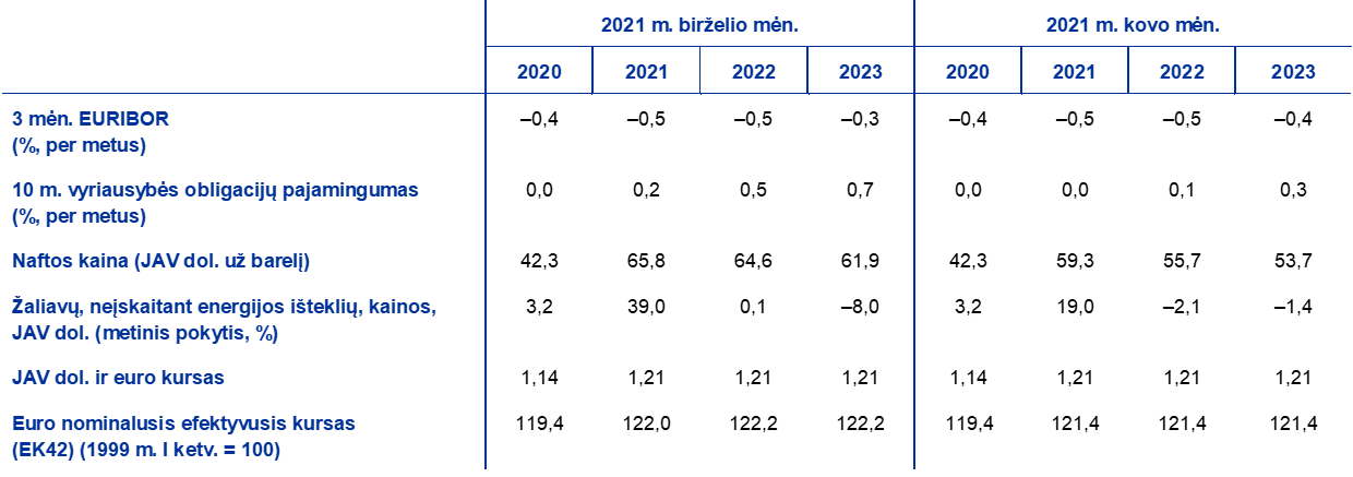 Palyginti su 2021 m. kovo mėn. prognozėmis, į dabartines technines prielaidas įtrauktos didesnės ilgalaikės palūkanų normos, gerokai didesnės naftos kainos ir šiek tiek didesnis euro efektyvusis kursas. Techninės prielaidos dėl palūkanų normų ir žaliavų kainų grindžiamos rinkos lūkesčiais (galutinė duomenų įtraukimo diena – 2021 m. gegužės 18 d.). Trumpalaikės palūkanų normos nustatomos pagal 3 mėn. EURIBOR, o rinkos lūkesčiai vertinami pagal ateities sandorių palūkanų normas. Pagal šią metodiką apskaičiuota vidutinė trumpalaikė palūkanų norma 2021 ir 2022 m. sudarys –0,5 %, o 2023 m. bus –0,3 %. Rinkos lūkesčiai dėl euro zonos 10 m. vyriausybės obligacijų nominaliojo pajamingumo leidžia tikėtis, kad 2021 m. pajamingumas vidutiniškai bus 0,2 %, 2022 m. – 0,5 %, o 2023 m. – 0,7 %[4]. Palyginti su 2021 m. kovo mėn. prognozėmis, lūkesčių dėl trumpalaikių palūkanų normų prognozė 2023 m. šiek tiek padidinta, o rinkos lūkesčių dėl euro zonos 10 m. vyriausybės obligacijų nominaliojo pajamingumo prognozė 2021–2023 m. padidinta maždaug 20–40 bazinių punktų.