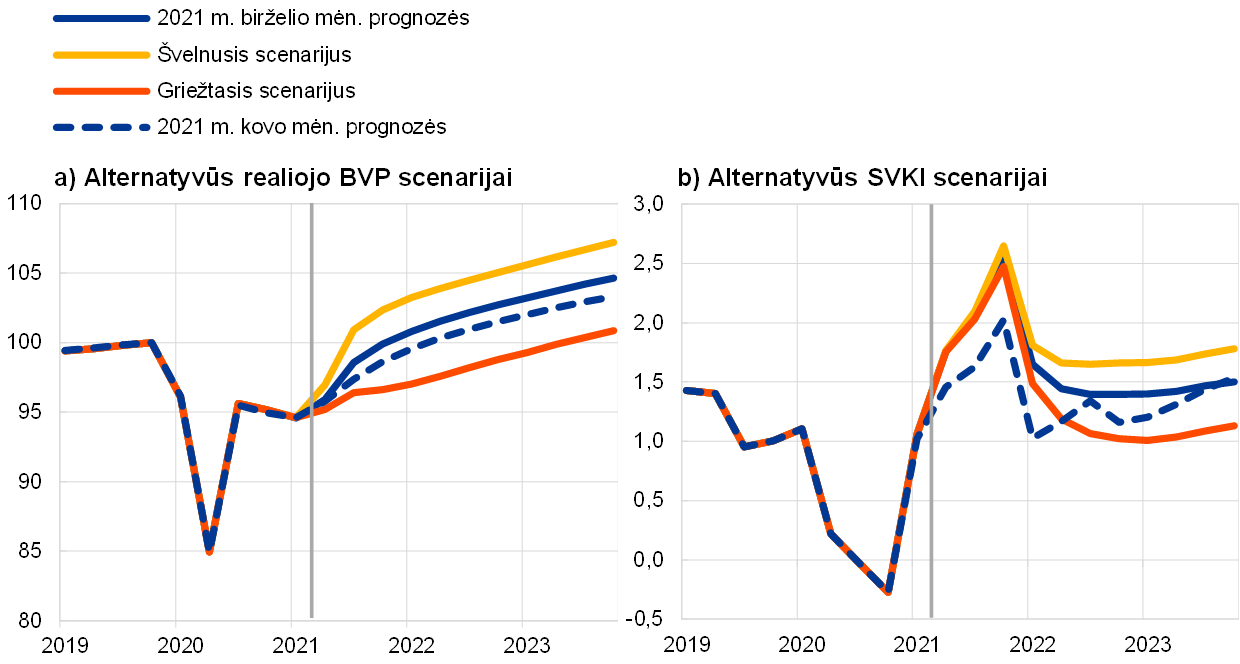 Kadangi tebėra daug neapibrėžtumo dėl COVID-19 pandemijos raidos ateityje ir dėl jos padarinių ekonomikai, parengti du alternatyvūs 2021 m. birželio mėn. Eurosistemos ekspertų pagrindinių prognozių scenarijai, parodantys galimą įvairų COVID-19 pandemijos poveikį euro zonos ekonomikai.