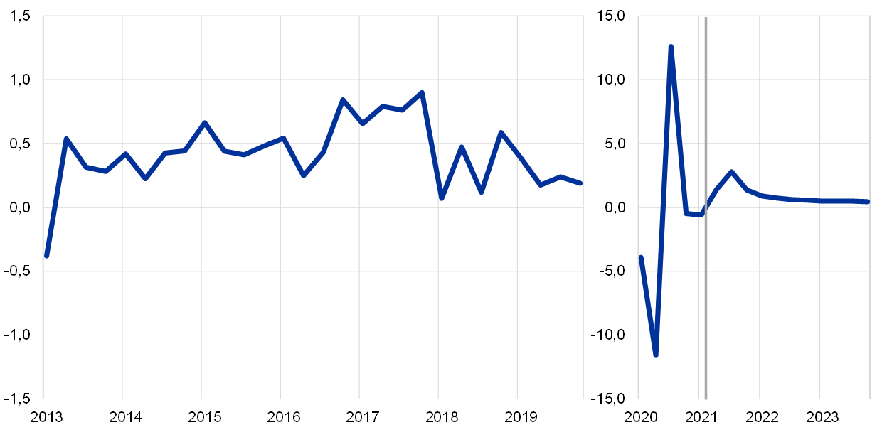 Pastabos: duomenys pakoreguoti dėl sezoniškumo ir darbo dienų. Istoriniai duomenys gali skirtis nuo pateiktų naujausiose Eurostato publikacijose, nes dalis duomenų buvo paskelbta po galutinės duomenų įtraukimo į šias prognozes dienos. Dėl precedento neturinčio realiojo BVP kintamumo 2020 m., laikotarpiui nuo 2020 m. pradžios paveiksle naudojama kitokia skalė. Vertikalia linija pažymėta prognozuojamo laikotarpio pradžia. Šiame paveiksle nerodomos prognozių ribos. Tai susiję su tuo, kad, esant dabartinėms aplinkybėms, ribas apskaičiavus įprastu būdu (pagal istorines prognozių klaidas), nebūtų tiksliai atspindėtas su dabartinėmis prognozėmis susijęs didesnis neapibrėžtumas. Vietoj to, siekiant kuo aiškiau parodyti dabartinį neapibrėžtumą, parengti ir 5 skyriuje pateikti du alternatyvūs scenarijai, pagrįsti skirtingomis prielaidomis dėl COVID-19 pandemijos raidos ir su ja susijusių viruso plitimo ribojimo priemonių bei ekonominių sutrikdymų masto.