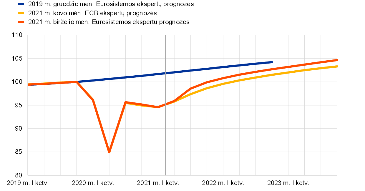 Pastabos: duomenys pakoreguoti dėl sezoniškumo ir darbo dienų. Istoriniai duomenys gali skirtis nuo pateiktų naujausiose Eurostato publikacijose, nes dalis duomenų buvo paskelbta po galutinės duomenų įtraukimo į šias prognozes dienos. Vertikalia linija pažymėta 2021 m. birželio mėn. prognozių laikotarpio pradžia.