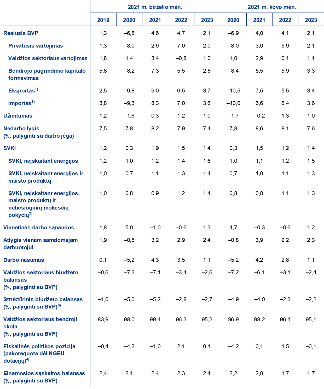 Pastabos: realiojo BVP ir jo sudedamųjų dalių, vienetinių darbo sąnaudų, atlygio vienam samdomajam darbuotojui ir darbo našumo raida pateikta pagal duomenis, pakoreguotus dėl sezoniškumo ir darbo dienų skaičiaus. Istoriniai duomenys gali skirtis nuo pateiktų naujausiose Eurostato publikacijose, nes dalis duomenų buvo paskelbta po galutinės duomenų įtraukimo į šias prognozes dienos. Šioje lentelėje nerodomos prognozių ribos. Tai susiję su tuo, kad, esant dabartinėms aplinkybėms, ribas apskaičiavus įprastu būdu (pagal istorines prognozių klaidas), nebūtų tiksliai atspindėtas su dabartinėmis prognozėmis susijęs didesnis neapibrėžtumas. Vietoj to, siekiant kuo aiškiau parodyti dabartinį neapibrėžtumą, parengti ir 5 skyriuje pateikti du alternatyvūs scenarijai, pagrįsti skirtingomis prielaidomis dėl COVID-19 pandemijos raidos, su ja susijusių viruso plitimo ribojimo priemonių ir ekonominių sutrikdymų masto.