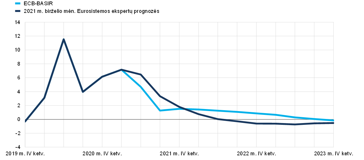 Pastaba: abi kreivės nukrypsta nuo 2019 m. gruodžio mėn. ekspertų prognozėse (šias prognozes nuspręsta laikyti lyginamąja iki pandemijos buvusia raida) numatytos taupymo normos. 2019 m. gruodžio mėn. prognozės pratęstos iki 2023 m., remiantis 2022 m. vidutiniu nominalių disponuojamųjų pajamų ir privačiojo vartojimo augimo tempu. ECB-BASIR modelyje 2021 m. birželio mėn. prognozės naudojamos iki 2021 m. pirmojo ketvirčio.