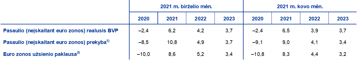 Metų pradžioje, nepaisant pandemijos suintensyvėjimo, pasaulio ekonomikos aktyvumo atsigavimas tęsėsi. Nors pasaulio realiojo BVP augimas (neįskaitant euro zonos) 2020 m. ketvirtąjį ketvirtį pasirodė besąs kiek didesnis, negu buvo tikėtasi rengiant 2021 m. kovo mėn. prognozes, pasaulio ekonomikos pagrindas šių metų pradžioje buvo trapesnis, nes dėl naujų užsikrėtimo atvejų šuolio 2021 m. pradžioje išsivysčiusios ekonomikos šalių vyriausybės buvo priverstos griežtinti viruso plitimo ribojimo priemones. Besivystančios rinkos ekonomikos šalyse fiksuoti dar didesni pandemijos mastai. Tačiau dėl Jungtinėje Karalystėje ir JAV sparčiai vykdytos vakcinacijos šiose šalyse pavyko sumažinti mirčių nuo COVID-19 atvejų skaičių, tad buvo galima pradėti švelninti viruso plitimo ribojimo priemones. Balandžio mėn. apklausų duomenys rodo, kad išsivysčiusios ekonomikos šalyse ekonomikos atsigavimas įgavo pagreitį, o paslaugų sektoriaus produkcija viršijo apdirbamosios gamybos rodiklius, nors jie taip pat stabiliai didėjo. Visa tai reiškia, kad atsigavimas yra vis platesnio masto, todėl ir stipresnis.