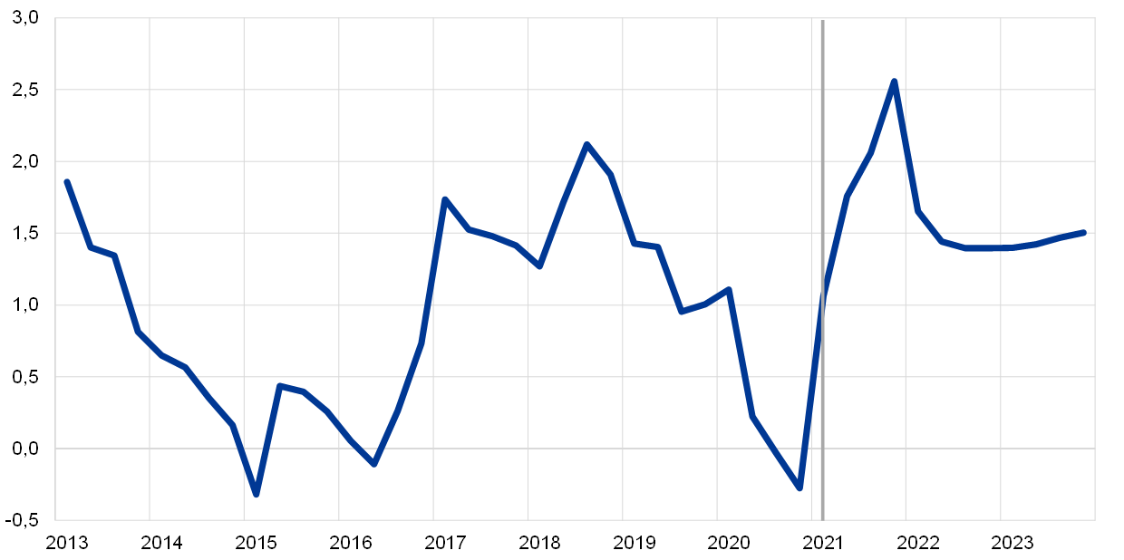 2) Apskaičiuota kaip euro zonos prekybos partnerių importo svertinis vidurkis.