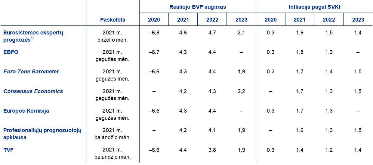 2021 m. birželio mėn. Eurosistemos ekspertų prognozės yra optimistiškesnės negu kitos 2021 ir 2022 m. augimo ir infliacijos prognozės, o dėl 2023 m. jas iš esmės atitinka. Kitos institucijos ir privačiojo sektoriaus subjektai prognozuoja, kad realiojo BVP pokytis 2022 m., palyginti su 2019 m., bus nuo 1,2 % (pagal TVF prognozes) iki 1,7 % (pagal Europos Komisijos prognozes), o 2021 m. birželio mėn. Eurosistemos ekspertų prognozėse pokytis numatomas gerokai didesnis – 2,1 %. Birželio mėn. ekspertų prognozėse infliacija numatoma didesnė tiek 2021 m., tiek 2022 m. – daugiausia dėl numatomos didesnės nepastovesnių infliacijos sudedamųjų dalių infliacijos, o 2023 m. infliacijos prognozė sutampa su TVF prognoze ir yra šiek tiek mažesnė negu kitų subjektų prognozės.