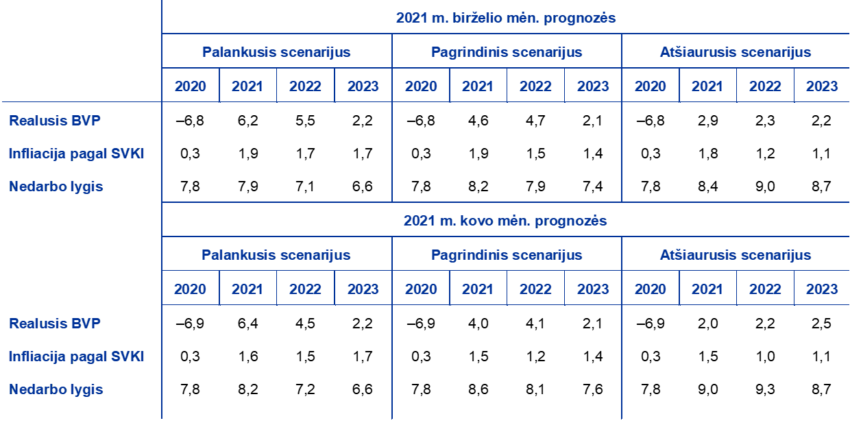 Atsižvelgiant į tebesitęsiantį neapibrėžtumą dėl tolesnės pandemijos raidos ir ekonominių sutrikdymų masto, vėl parengti du alternatyvūs scenarijai: palankusis scenarijus, pagal kurį daroma prielaida, kad sveikatos krizę pavyks įveikti greičiau, ir atšiaurusis scenarijus, pagal kurį daroma prielaida, kad pandemija užsitęs. Šie alternatyvūs scenarijai aprašyti 5 skyriuje.