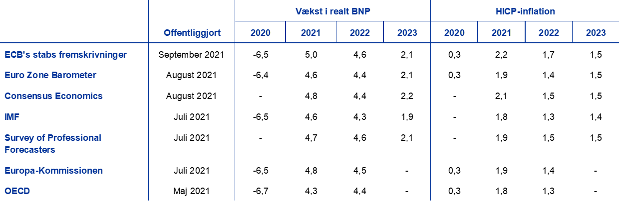 ECB's stabs fremskrivninger fra september 2021 ligger, både hvad angår vækst og inflation, højere i den første del af fremskrivningsperioden end de prognoser, som er udarbejdet af andre institutioner, mens de er stort set på linje med dem i 2023. I prognoser fra diverse andre institutioner og den private sektor forventes realt BNP i 2021 at blive på 4,3 pct. i OECD's (nu noget forældede) prognose og på 4,8 pct. for så vidt angår Europa-Kommissionen og Consensus Economics. ECB's stabs fremskrivninger ligger med 5,0 pct. noget over dette interval. Det kan delvis skyldes en senere skæringsdato, der har gjort det muligt at tage højde for det foreløbige skøn over BNP i 2. kvartal 2021. Når det gælder 2022 og 2023, befinder fremskrivningen fra september sig inden for et snævrere prognoseinterval. Hvad angår inflationen, ligger fremskrivningen, som ECB's stab har udarbejdet, lidt højere for både 2021 og 2022, hovedsagelig på grund af en højere forventet inflation i de mere volatile komponenter, mens den i 2023 er fuldt ud på linje med de fleste andre prognoser.