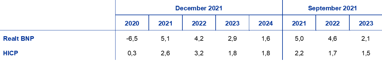 Den økonomiske vækst ventes at fortsat at være kraftig i de næste tre år, selvom den på kort sigt vil blive dæmpet af visse faktorer.[1] Et stærkt stigende antal tilfælde af coronasmitte (covid-19) i flere eurolande har ført til en fornyelse af restriktionerne og større usikkerhed om pandemiens varighed. Den nye omikronvariant har øget denne usikkerhed.[2] Desuden er forsyningsflaskehalsene blevet øget og forventes nu at vare længere, således at de først gradvis forsvinder fra 2. kvartal 2022 og vil være fuldt afviklede i 2023. Realt BNP forventes nu at nå det samme niveau som før krisen i 1. kvartal 2022 – et kvartal senere end forventet i fremskrivningerne fra september 2021. I takt med at de globale begrænsninger på udbudssiden aftager, de pandemirelaterede restriktioner og den dermed forbundne usikkerhed mindskes, og inflationen falder fra sit høje niveau, forventes væksten imidlertid at tage fart igen fra midten af 2022 til trods for en mindre understøttende finanspolitik og højere markedsforventninger til renten. Det private forbrug vil fortsat være den vigtigste drivkraft bag den økonomiske vækst, idet det fremmes af en stigning i den disponible realindkomst, en vis afvikling af den akkumulerede opsparing og et robust arbejdsmarked, hvor arbejdsløsheden ved udgangen af fremskrivningsperioden er lavere end på et hvilket som helst tidspunkt, siden euroområdet blev oprettet i 1999. Sammenlignet med september 2021-fremskrivningerne har de øgede globale forsyningsflaskehalse og strammere pandemirelaterede restriktioner ført til en nedjustering af væksten på kort sigt. Samtidig bør den gradvise afvikling af disse begrænsende faktorer understøtte en kraftigere genopretning fra 2. kvartal 2022. Dette fører ved udgangen af 2022 til en stigning i realt BNP til et højere niveau end det, der var ventet i september 2021-fremskrivningerne, med følgevirkninger, som resulterer i en betydelig opjustering af den årlige vækst i 2023.
