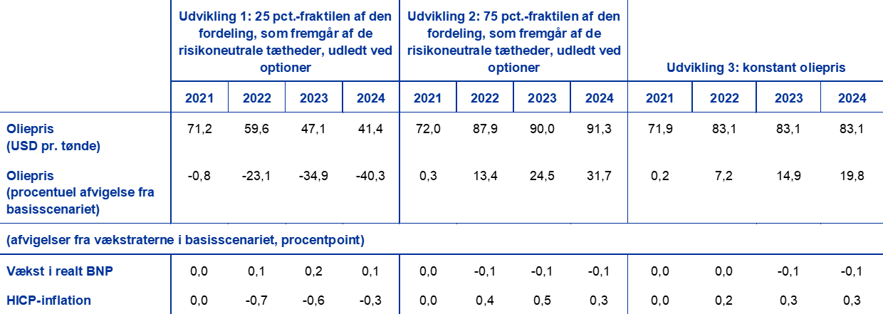 Formålet med denne følsomhedsanalyse er at vurdere konsekvenserne af en alternativ udvikling i oliepriserne. De tekniske antagelser om udviklingen i oliepriserne er baseret på oliefutures. Flere forskellige udviklingsmønstre i olieprisen analyseres. Det første er baseret på 25 pct.-fraktilen af den fordeling, som fremgår af tæthederne udledt ved optioner (option-implied densities) for olieprisen 25. november 2021, der er skæringsdatoen for de tekniske antagelser. Denne udvikling indebærer et gradvist fald i olieprisen til ca. 40 pct. under antagelsen i basisscenariet for 2024. På grundlag af gennemsnittet af en række af de makroøkonomiske modeller, som staben anvender, ville denne udvikling have en lille opadrettet effekt på væksten i realt BNP og en mere markant nedadrettet effekt på HICP-inflationen i hele fremskrivningsperioden. Det andet udviklingsmønster er baseret på 75 pct.-fraktilen af den samme fordeling og indebærer en stigning i olieprisen til ca. 32 pct. over antagelsen i basisscenariet for 2024. Denne udvikling ville have en meget lille nedadrettet effekt på væksten i realt BNP og en noget kraftigere opadrettet effekt på HICP-inflationen i 2022-24. Det tredje udviklingsmønster er baseret på en antagelse om, at olieprisen forbliver på det samme niveau som på skæringsdatoen, dvs. 83,1 USD pr. tønde, hvilket i 2024 vil være ca. 20 pct. højere end antagelsen i basisscenariet for det år. Denne udvikling ville have en marginal nedadrettet effekt på væksten i realt BNP i 2023-24, mens HICP-inflationen ville blive 0,2-0,3 procentpoint højere i 2022-24.