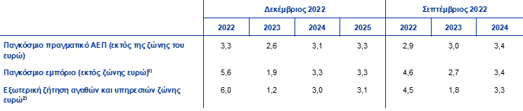 Η παγκόσμια ανάπτυξη αναμένεται, σύμφωνα με τις προβολές, να καταγράψει υποτονική δυναμική το 2023, αλλά στη συνέχεια να ανακάμψει σταδιακά. Ο ρυθμός αύξησης του παγκόσμιου πραγματικού ΑΕΠ (εκτός της ζώνης του ευρώ) αναμένεται, βάσει των προβολών, να επιβραδυνθεί έντονα το 2023 σε 2,6%, να διαμορφωθεί πολύ χαμηλότερα από τον μακροχρόνιο μέσο όρο του (3,6%), και να επιταχυνθεί το 2024 και το 2025 σε 3,1% και 3,3% αντίστοιχα. Αυτή η εξασθένηση της παγκόσμιας οικονομίας οφείλεται κυρίως στις μεγάλες προηγμένες οικονομίες και την Κίνα. Η οικονομία των ΗΠΑ αναμένεται, βάσει των προβολών, να επιβραδυνθεί σημαντικά λόγω των δυσμενέστερων από ό,τι αναμενόταν χρηματοπιστωτικών συνθηκών, οι οποίες επηρεάζουν αρνητικά την καταναλωτική δαπάνη και τις επενδύσεις. Η οικονομία του Ηνωμένου Βασιλείου είναι πιθανό να εισέλθει σε ύφεση, καθώς η ιδιωτική κατανάλωση πλήττεται από τις υψηλές τιμές καταναλωτή και το αυξανόμενο κόστος δανεισμού. Στην Κίνα, ο ρυθμός αύξησης του πραγματικού ΑΕΠ το 2022 αναμένεται να αποκλίνει του στόχου που είχε θέσει η κυβέρνηση και να παραμείνει σε επίπεδο πολύ χαμηλότερο των προ της πανδημίας μέσων ρυθμών ανάπτυξης για το υπόλοιπο του χρονικού ορίζοντα προβολής. Στη Ρωσία, η οικονομία εισήλθε σε ύφεση το 2022, η οποία ήταν λιγότερο σοβαρή από ό,τι αναμενόταν αρχικά, λόγω της ανακατεύθυνσης των ρωσικών εξαγωγών πετρελαίου προς τις ασιατικές χώρες. Σε σύγκριση με τις προβολές του Σεπτεμβρίου 2022, ο ρυθμός αύξησης του παγκόσμιου πραγματικού ΑΕΠ (χωρίς τη ζώνη του ευρώ) έχει αναθεωρηθεί προς τα άνω για το 2022 και προς τα κάτω για το 2023 και το 2024. Η αναθεώρηση προς τα άνω για το 2022 αντανακλά κυρίως το καλύτερο από ό,τι αναμενόταν αποτέλεσμα για το γ΄ τρίμηνο στις ΗΠΑ, την Κίνα και τη Ρωσία. Η χαμηλότερη οικονομική ανάπτυξη στη διάρκεια του χρονικού ορίζοντα προβολής οφείλεται κυρίως στην Κίνα και, το 2024, στις ΗΠΑ.
