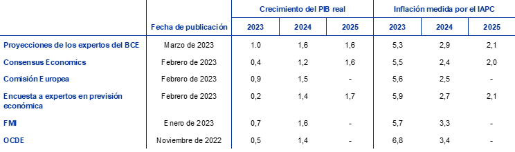 Fuentes: Consensus Economics Forecasts, 16 de febrero de 2023 (los datos correspondientes a 2025 proceden de la encuesta de enero de 2023); Previsiones económicas (intermedias) de invierno de 2023 de la Comisión Europea, 13 de febrero de 2023; encuesta del BCE a expertos en previsión económica, 3 de febrero de 2023; actualización de las Perspectivas de la Economía Mundial del FMI, 30 de enero de 2023; Perspectivas Económicas de la OCDE de noviembre de 2022, n.º 112, 22 de noviembre de 2022.