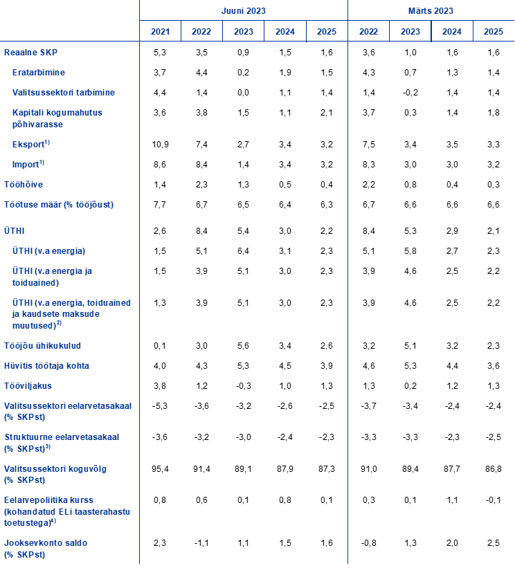 2023. aasta märtsi ettevaatega võrreldes on SKP reaalkasvu 2023. ja 2024. aasta prognoosi korrigeeritud 0,1 protsendipunkti võrra allapoole, kuid 2025. aasta prognoos jääb samaks. Laenutingimuste karmistumine peaks pärssima kasvu 2023. aastal mõnevõrra rohkem, kui 2023. aasta märtsi ettevaates prognoositi, kuid 2024.–2025. aastal jääb nende mõju üldjoontes samaks. Ka varude mõju peaks kujunema 2023. aastal märtsi ettevaates prognoosituga võrreldes väiksemaks. Pikemas perspektiivis peaks netoekspordi väiksemat mõju eelkõige 2024. aastal tasakaalustama tugevam sisenõudlus, mida toetavad reaalse kasutatava tulu jõulisem kasv ja ebakindluse taandumine.