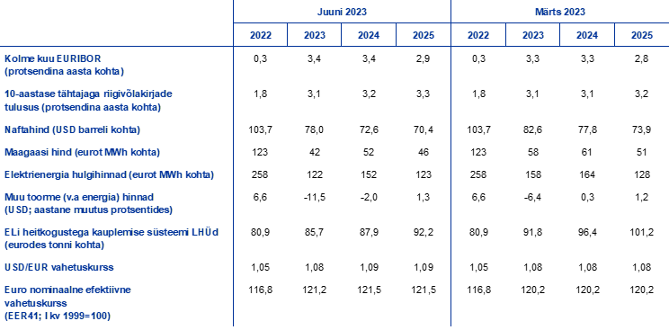Eurosüsteemi ekspertide 2023. aasta märtsi ettevaatega võrreldes hõlmavad tehnilised eeldused veidi kõrgemaid intressimäärasid, madalamat naftahinda, oluliselt madalamaid gaasi ja elektri hulgihindu ning euro kallinemist. Tehnilised eeldused intressimäärade ja toormehindade kohta põhinevad turgude ootustel seisuga 23. mai 2023. Lühiajalisi intressimäärasid mõõdetakse kolme kuu EURIBORina ja turgude ootused tuletatakse futuurilepingute intressimääradest. Pikaajaliste intressimäärade prognoosimisel lähtutakse riikide kümneaastase tähtajaga võlakirjade tulususest.[4] Alates 2023. aasta märtsi ettevaate koostamise lõppkuupäevast on nii lühi- kui ka pikaajalised intressimäärad mõnevõrra tõusnud. Selle suundumuse taustal on nende prognoose ligikaudu 10 baaspunkti võrra ülespoole korrigeeritud, pidades silmas EKP baasintressimäärade edasist tõusu.