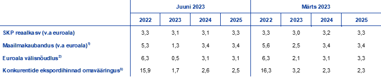 Maailmamajanduse kasv jätkus selle aasta alguses tugevamalt aluselt, peaks ettevaateperioodil mõõdukalt kiirenema ja 2025. aastal mõnevõrra veelgi hoogustuma. Üleilmse (v.a euroala) SKP kasvu näitajad olid 2023. aasta esimeses kvartalis prognoositust kõrgemad. Sealjuures oli kasv oodatust hoogsam nii Hiinas (seoses eeldatust kiirema ja jõulisema elavnemisega pandeemiapiirangutest loobumise järel) kui ka Ameerika Ühendriikides vastupidava tööturu tingimustes. USA pangandussektori probleemidest tingitud kriis märtsi alguses tõi üleilmsetel finantsturgudel kaasa lühiajalised teravad pinged. Pärast seda on enamik varaklasse hoolimata püsivast ebakindlusest oma kahjumist taastunud. Maailmamajandus (v.a euroala) peaks sel ja järgmisel aastal kasvama 3,1%. 2025. aastal hoogustub see 3,3%ni. Kasvuväljavaade on jäänud 2023. aasta märtsi ettevaates prognoosituga võrreldes üldjoontes samaks.