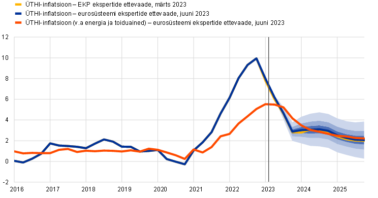 Ühtlustatud tarbijahinnaindeksiga (ÜTHI) mõõdetav inflatsioon on hoolimata energiahindade langusest ja pakkumispoolsete kitsaskohtade leevenemisest osutunud varem eeldatust püsivamaks. Kuna energiahindade inflatsioon muutub 2023. aasta jooksul eeldatavalt üha negatiivsemaks ja toiduainehindade inflatsioon aeglustub järsult, peaks koguinflatsioon jätkuvalt aeglustuma ja olema aasta viimases kvartalis ligikaudu 3%. Sellegipoolest on ÜTHI-inflatsioon (v.a energia ja toiduained) lähiajal tõenäoliselt koguinflatsioonist kiirem ja püsib sellel tasemel eeldatavalt kuni 2024. aasta alguseni, ehkki peaks alates käesoleva aasta teisest poolest vähehaaval aeglustuma. Sedamööda, kuidas varasemate energiahinnašokkide ja muu hindadega seotud voogsurve kaudne mõju järk-järgult taandub, hoogustades oodatavat aeglustumist, kujunevad tööjõukulud ÜTHI-inflatsiooni (v.a energia ja toiduained) peamiseks tõukejõuks. Palgakasv peaks valdava osa ettevaateperioodi jooksul püsima senisest keskmisest rohkem kui kaks korda kiirem. Selle põhjuseks on inflatsioonihüvitiste mõju, pingelised tööturutingimused ning miinimumpalkade tõus. Sellegipoolest peaksid 2022. aastal märkimisväärselt kasvanud kasumimarginaalid toimima puhvrina, et mõningal määral korvata nende kulude ülekandumist keskpikas perspektiivis. Ühtlasi peaks rahapoliitika lähiaastatel alusinflatsiooni veelgi pidurdama. Koguinflatsioon peaks aeglustuma 8,4%-lt 2022. aastal keskmiselt 5,4%-le 2023. aastal, 3,0%-le 2024. aastal ja 2,2%-le 2025. aastal. 2023. aasta märtsi ettevaatega võrreldes on koguinflatsiooni prognoosi terveks ettevaateperioodiks veidi ülespoole korrigeeritud. Selle peamine põhjus on ÜTHI-inflatsiooni (v.a energia ja toiduained) prognoosi märkimisväärne ülespoole korrigeerimine, mis kajastab hiljutisi oodatust kõrgemaid inflatsiooninäitajaid ja mõnevõrra suuremaid tööjõu ühikukulusid, mis kaalusid täielikult üles madalamate energiahindade eelduste ja rangemate rahastamistingimuste mõju.