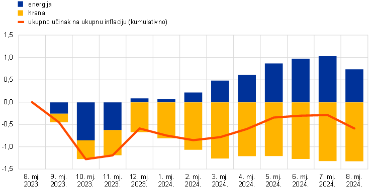 Napomene: Kumulativni utjecaj baznih učinaka uvijek se prikazuje u odnosu na određeni referentni mjesec. Na primjer, bazni učinci povezani s energijom upućivali bi na povećanje ukupne inflacije mjerene HIPC‑om za 1,0 postotnih bodova u lipnju 2024. u odnosu na stopu inflacije u kolovozu 2023. Isto tako, baznim učincima povezanima sa sastavnicom hrane objasnilo bi se smanjenje ukupne inflacije mjerene HIPC‑om za 1,3 postotna boda u lipnju 2024. u odnosu na kolovoz 2023. Bazni učinci povezani s hranom i energijom zajedno bi smanjili ukupnu inflaciju mjerenu HIPC‑om u lipnju 2024. za 0,3 postotna boda u odnosu na stopu u kolovozu 2023.
