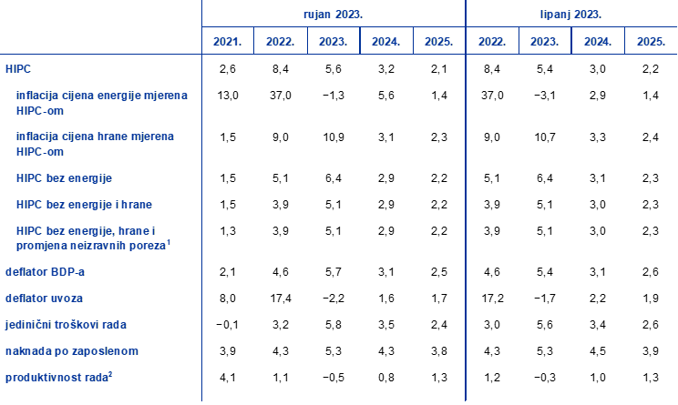 U odnosu na projekcije iz lipnja 2023. projekcija inflacije mjerene HIPC‑om revidirana je naviše za 0,2 postotna boda u 2023. i 2024. te je revidirana naniže za 0,1 postotni bod u 2025. Sastavnica energije revidirana je naviše za 2023. i 2024. zbog iznenađujućih vrijednosti novih podataka, viših terminskih cijena nafte i promjena reguliranih cijena. Te revizije naviše djelomično su neutralizirane revizijama naniže sastavnica bez energije. Inflacija cijena hrane revidirana je naviše za 2023., uglavnom zbog iznenađujuće visokih vrijednosti podataka, te naniže za 2024. i 2025. zbog nižih tehničkih pretpostavki o cijenama na poljoprivrednom gospodarstvu u europodručju. Inflacija mjerena HIPC‑om bez energije i hrane nije revidirana za 2023., ali je revidirana naniže za 2024. i 2025. zbog aprecijacije eura i slabijih izgleda za potražnju.