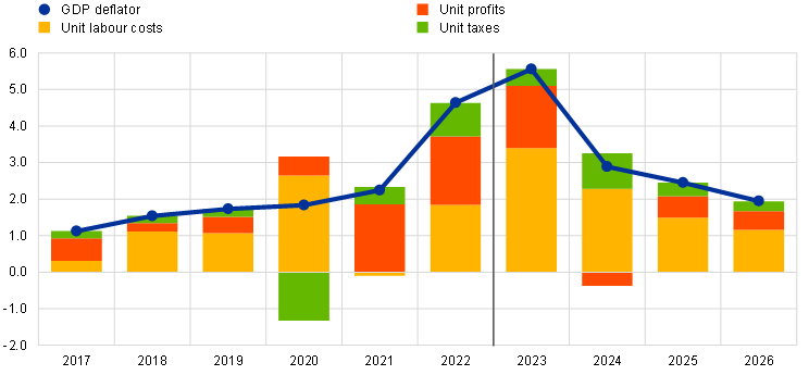 8. For more information on the GDP deflator decomposition and the role of unit profits for inflation analysis, see the box by E. Hahn, entitled “How have unit profits contributed to the recent strengthening of euro area domestic price pressures?”, Economic Bulletin, Issue 4, ECB, 2023; as well as Arce, O., Hahn, E. and Koester, G., “How tit-for-tat inflation can make everyone poorer”, ECB Blog, 30 March 2023.