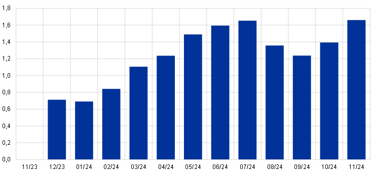 V porovnaní s projekciami zo septembra 2023 technické predpoklady zahŕňajú nižšie krátkodobé úrokové miery eurozóny, nižšie ceny energií a znehodnocovanie eura. Technické predpoklady týkajúce sa úrokových sadzieb a cien komodít vychádzajú z očakávaní trhu ku dňu uzávierky 23. novembra 2023. Krátkodobé úrokové miery vychádzajú z trojmesačnej sadzby EURIBOR, pričom trhové očakávania sú odvodené z úrokových mier futures. Dlhodobé úrokové miery sú vyjadrené prostredníctvom výnosov desaťročných štátnych dlhopisov.[4] Predpoklady v oblasti krátkodobých úrokových mier boli počas sledovaného obdobia upravené nadol, zatiaľ čo výnosy desaťročných štátnych dlhopisov zostali v podstate nezmenené.