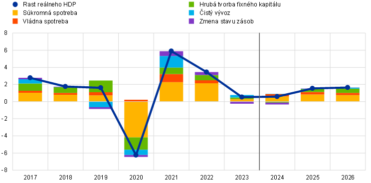 Rast reálneho HDP by mal zostať začiatkom roka 2024 tlmený v dôsledku miznutia pozitívnych impulzov a prísnych podmienok financovania. Neskôr by sa mal zrýchliť za podpory rastu príjmov domácností, vládnej spotreby a zahraničného dopytu. Hospodársky stimul prameniaci zo znovuotvorenia hospodárstva po pandémii sa vytráca, pričom brzdiaci účinok prísnych podmienok financovania a zvýšenej neistoty spotrebiteľov je naďalej významný. Výhľadové ukazovatele z prieskumov zostali počas prvých dvoch mesiacov roka 2024 v priemere v pásme kontrakcie. Kúpnu silu domácností by však v prvej polovici tohto roka mala podporiť klesajúca inflácia a výrazný rast miezd v podmienkach pretrvávajúceho nedostatku pracovných síl. Hospodárska aktivita by preto mala ťažiť najmä zo súkromnej spotreby. V druhej polovici roka 2024 by sa mal rast ďalej mierne zrýchľovať vďaka zvyšovaniu súkromnej spotreby v dôsledku rastu reálneho disponibilného príjmu a očakávaného oživenia dôvery. V priebehu roka 2024 sa predpokladá aj zvýšenie vládnej spotreby, čiastočne v dôsledku oneskorenej inflačnej kompenzácie miezd vo verejnom sektore, zatiaľ čo vývoz by mal ďalej dobiehať zahraničný dopyt. V strednodobom horizonte sa očakáva ďalšie zrýchľovanie rastu reálneho HDP až na úroveň tesne nad priemerom spred pandémie, ku ktorému majú prispievať rastúce reálne príjmy, stúpajúci zahraničný dopyt a menší brzdiaci účinok menovej a rozpočtovej politiky (tabuľka 2). Rušenie podporných rozpočtových opatrení zavedených od roku 2022 na kompenzáciu vysokej inflácie a cien energií bude mať v rokoch 2024 až 2026 malý negatívny vplyv na rast, celková orientácia rozpočtovej politiky však bude v rokoch 2025 a 2026 zhruba neutrálna.