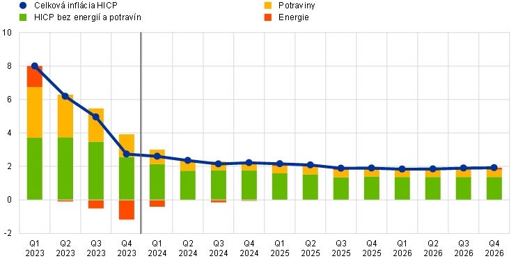 Inflácia by sa mala ďalej zmierňovať v dôsledku pokračujúceho uvoľňovania tlakov v cenovom reťazci a vplyvu sprísnenia menovej politiky, aj keď pomalším tempom ako v roku 2023. Tlaky v cenovom reťazci by mali naďalej slabnúť, keďže sa očakáva, že narušenia lodnej prepravy v Červenom mori budú mať len obmedzený vplyv na rast cien. S poklesom cien energií by hlavným faktorom inflácie v harmonizovanom indexe spotrebiteľských cien (Harmonised Index of Consumer Prices – HICP) bez energií a potravín mal byť výrazný vývoj nákladov práce. Rast nominálnych miezd by mal zostať zvýšený, a to v dôsledku pretrvávajúceho nedostatku pracovných síl na trhu práce, ale vzhľadom na slabnutie rastových vplyvov inflačnej kompenzácie by sa mal počas sledovaného obdobia postupne znižovať. Oživenie rastu produktivity by malo prispieť k zmierneniu tlakov vyplývajúcich z nákladov práce. Rast ziskov by sa mal počas sledovaného obdobia spomaliť a mal by tlmiť účinky nákladov práce. Ročná priemerná celková inflácia HICP má klesnúť z 5,4 % v roku 2023 na 2,3 % v roku 2024, 2,0 % v roku 2025 a 1,9 % v roku 2026. Vzhľadom na slabý výhľad inflácie cien energií sa očakáva, že celková inflácia zostane počas celého sledovaného obdobia pod úrovňou inflácie HICP bez cien energií a potravín. V porovnaní s projekciami z decembra 2023 bola inflácia HICP na roky 2024 a 2025 upravená nadol, najmä v dôsledku priamych a nepriamych účinkov nižších predpokladaných cien energetických komodít a nižších tlakov vyplývajúcich z nákladov práce, a na rok 2026 zostáva bez zmeny.