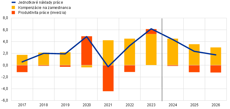 Rast nominálnych miezd má podľa projekcií postupne klesať, ale až do roku 2025 má zostať na zvýšenej úrovni a umožňovať dobiehanie reálnych miezd na úrovne spred prudkého nárastu inflácie. Rast kompenzácií na zamestnanca sa v poslednom štvrťroku 2023 podľa odhadov spomalil a počas sledovaného obdobia by sa mal ďalej zmierňovať, hoci v dôsledku pretrvávajúceho nedostatku pracovných síl, inflačnej kompenzácie a zvyšovania minimálnych miezd by mal oproti historickej úrovni zotrvať zvýšený. Na konci sledovaného obdobia by mal dosiahnuť 3,0 %, čo je miera, ktorá celkovo zodpovedá súčtu projektovaného rastu produktivity a inflácie. V porovnaní s projekciami z decembra 2023 bola miera rastu na rok 2024 upravená mierne nadol, keďže sa očakáva, že nižší rozdiel medzi skutočnými a dojednanými mzdami spôsobený slabším hospodárskym výhľadom viac než vyrovná rýchlejší rast dojednaných miezd. Rast kompenzácií na zamestnanca bol upravený nadol i na roky 2025 a 2026, a to v dôsledku očakávaného skoršieho oživenia reálnych miezd a zodpovedajúcich očakávaní o niečo nižšieho dopytu po inflačnej kompenzácii. Očakáva sa, že rast jednotkových nákladov práce dosiahol v roku 2023 vrchol, a predpokladá sa jeho výrazný pokles, čiastočne vďaka predpokladanému zrýchleniu rastu produktivity (graf 8).