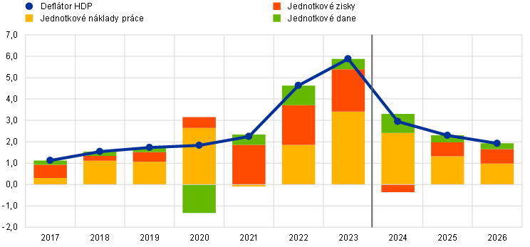 Domáce cenové tlaky merané rastom deflátora HDP by sa mali podľa projekcií naďalej postupne znižovať. Rast ziskov by mal najskôr tlmiť tlaky vyplývajúce z vysokých nákladov práce a neskôr by mal zaznamenať oživenie (graf 9). Ročná miera rastu deflátora HDP dosiahla vrchol na úrovni 6,3 % v prvom štvrťroku 2023. Predpokladá sa, že bude ďalej rýchlo klesať, na priemernú úroveň 2,9 % v roku 2024. Neskôr má klesať miernejším tempom až na priemernú úroveň 1,9 % v roku 2026. Začiatkom roka 2023 kulminoval i rast jednotkových ziskov a odvtedy sa spomaľuje. Očakáva sa, že v roku 2024 prejde do záporného pásma, čo znamená, že zisky budú tlmiť pomerne výrazný rast nákladov práce. So zmierňovaním rastu jednotkových nákladov práce sa očakáva určité oživenie rastu jednotkových ziskov od roku 2025 za podpory výrazného hospodárskeho oživenia a rastúceho rastu produktivity.[19]