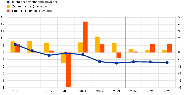 Trh práce zostáva stabilný, hoci sa mierne ochladzuje vzhľadom na očakávané ustálenie rastu zamestnanosti po výraznom raste zaznamenanom v roku 2023. Zhruba podobne ako v projekciách z decembra 2023 sa očakáva, že rast celkovej zamestnanosti sa spomalí z 1,4 % v roku 2023 na 0,5 % v roku 2024 a následne sa ustáli na úrovni 0,3 % v roku 2025 a 0,4 % v roku 2026 (graf 3). Očakáva sa, že rast produktivity práce sa počas sledovaného obdobia zrýchli, úroveň produktivity by však v roku 2026 mala zostať výrazne pod dlhodobým lineárnym trendom. Miera nezamestnanosti by mala mať mierne zvlnený priebeh: v oneskorenej reakcii na slabú hospodársku aktivitu sa predpokladá zvýšenie na 6,7 % v roku 2024 a následné zníženie na 6,6 % v rokoch 2025 a 2026. Miera nezamestnanosti bola revidovaná nahor o 0,1 percentuálneho bodu na roky 2024 a 2025 a o 0,2 percentuálneho bodu na rok 2026.