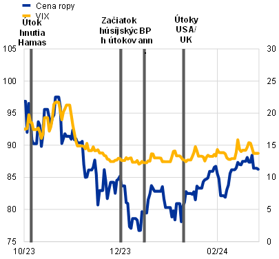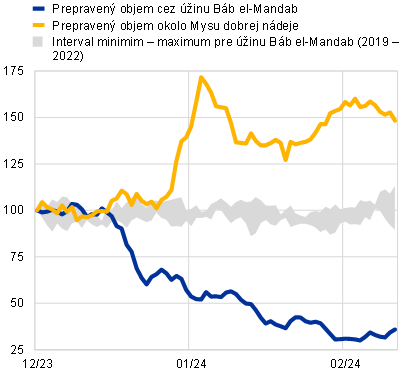 Poznámky: V paneli a) sa objemy námorného tranzitu počítajú ako sedemdňový kĺzavý priemer, pričom interval od minima do maxima vyjadruje historický vývoj prepravených objemov od roku 2019 do roku 2022 a vo vzťahu k prepravovaným objemom 1. decembra v danom roku. V paneli b) BP ann. odkazuje na oznámenie British Petroleum o pozastavení prepravy cez Červené more. V paneli d) sa používa obrátená os, na ktorej boli najnižšie hodnoty indexu PMI pre dodacie lehoty dodávateľov zaznamenané v apríli 2022 v prípade svetových údajov (bez eurozóny), v júli 2021 v prípade Spojených štátov, v máji 2021 v prípade eurozóny a v apríli 2020 v prípade Číny a Spojeného kráľovstva. Posledné údaje sú z 11. februára 2024 (objemy námorného tranzitu), z 26. februára 2024 (ceny ropy a index volatility VIX) a z 23. februára 2024 (ceny prepravy).