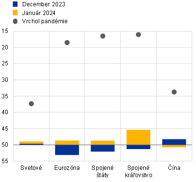 Svetový hospodársky rast sa na prelome rokov zmiernil, keďže sprísňovanie menovej politiky sa naďalej prenášalo do ekonomiky.[7] V porovnaní s odhadovaným tempom 3,5 % v roku 2023 by sa mal svetový rast tento rok podľa projekcií mierne znížiť na 3,4 %. Jeho mierny pokles je odrazom doznievania priaznivých faktorov, ako je vyčerpanie nadmerných úspor a postupné ochladzovanie trhu práce, ktoré predtým podporovali spotrebné výdavky vo vyspelých ekonomikách. Predpokladá sa, že svetový rast sa v rokoch 2025 a 2026 spomalí na 3,2 % ročne, čo je mierne pod priemerom za posledné desaťročie. V Spojených štátoch sa v tomto roku očakáva oslabenie rastu vzhľadom na prebiehajúcu korekciu trhu práce a transmisiu prísnej menovej politiky a podmienok poskytovania bankových úverov. V Číne zostávajú spotrebné výdavky obmedzené vzhľadom na nepriaznivé podmienky na trhu s nehnuteľnosťami. V porovnaní s projekciami z decembra 2023 bola projekcia svetového hospodárskeho rastu na tento rok upravená nahor, prevažne v dôsledku nečakane pozitívnych výsledkov vo významných ekonomikách, najmä v Spojených štátoch, na konci roka 2023.
