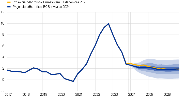 V porovnaní s projekciami z decembra 2023 bol výhľad vývoja celkovej inflácie HICP upravený nadol o 0,4 percentuálneho bodu na rok 2024 a o 0,1 percentuálneho bodu na rok 2025, zatiaľ čo na rok 2026 zostáva nezmenený. Inflácia HICPX bola na celé sledované obdobie upravená nadol. Zníženie projekcie inflácie HICP na rok 2024 je spôsobené najmä energetickou zložkou, ktorá by mala byť nižšia v dôsledku nedávnych nečakaných údajov a nižších cien energetických komodít. Očakáva sa postupné premietanie nepriamych účinkov nižších cien energií. To spolu s výhľadom slabšieho hospodárskeho rastu a pomalším rastom jednotkových nákladov práce vedie k zníženiu projekcií inflácie HICPX počas sledovaného obdobia. Na rok 2026 zostáva projekcia celkovej inflácie nezmenená vzhľadom na úpravu inflácie cien energií smerom nahor v dôsledku výraznejšie rastúcich kriviek cien ropných a plynových futures, ktoré kompenzujú úpravy mier inflácie cien potravín a HICPX nadol.