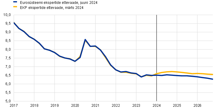 Euroala majandus taastus 2024. aasta alguses ulatuslikumalt, kui EKP ekspertide 2024. aasta märtsi ettevaates prognoositi. Seda hoogustasid netokaubandus ja kodumajapidamiste suurenenud kulutused. Laekunud andmed näitavad, et lähiajal jätkub kasv varem eeldatust kiiremas tempos. Reaalne kasutatav tulu peaks jõulise palgakasvu, järk-järgult suureneva kindlustunde ja kaubandustingimuste paranemise toel jätkuvalt suurenema, tuues 2024. aastal kaasa tarbimisest tingitud elavnemise. Netokaubanduse hoogustumisest tulenenud positiivne mõju aasta alguses kajastab osaliselt volatiilsust, mis järgnes ajutisele langusele 2023. aasta lõpus. Välisnõudlus peaks siiski endiselt suurenema, toetades euroala ekspordi kasvu. Keskpikas perspektiivis peaks rahapoliitika varasema karmistamise negatiivne mõju vähehaaval taanduma ning aktiivsust peaks toetama rahastamistingimuste eeldatav leevenemine kooskõlas turgude ootustega intressimäärade edasise arengu suhtes. Kasvu soodustab ka vastupidav tööturg, kusjuures töötuse määr langeb ettevaateperioodi hilisemas etapis rekordiliselt madalale tasemele. Sedamööda, kuidas viimasel ajal tööviljakuse kasvu aeglustanud mõned tsüklilised tegurid taanduvad, peaks tööviljakus ettevaateperioodil suurenema. Üldjoontes eeldatakse, et keskmine aastane SKP reaalkasv on 2024. aastal 0,9% ning hoogustub 2025. aastal 1,4%ni ja 2026. aastal 1,6%ni. 2024. aasta märtsi ettevaatega võrreldes on SKP kasvu väljavaadet korrigeeritud 2024. aastaks ülespoole. Selle põhjuseks on aasta alguses valitsenud oodatust positiivsemad suundumused ja laekunud andmete paranemine. 2025. aasta SKP kasvuprognoosi on veidi allapoole korrigeeritud, 2026. aasta prognoos jääb aga samaks.[1]